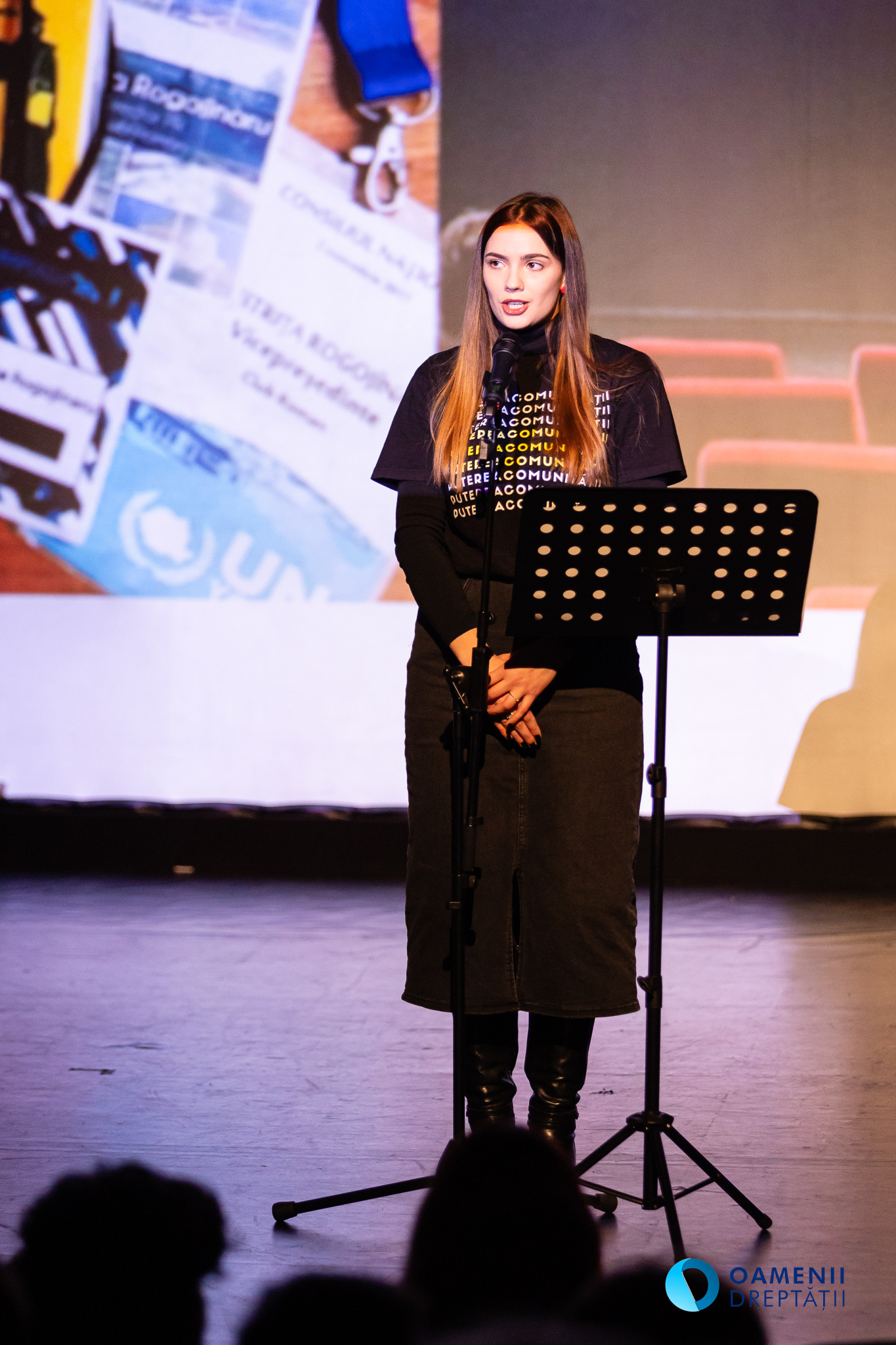 Merg în licee cu ateliere de educație juridică. Fac filme despre fața umană a justiției. Fac ghiduri pe înțelesul cetățenilor sau scot în evidență probleme reale prea puțin atinse în societate și în justiție. Și mai cred în ceva: în vulnerabilitate și în empatie și în puterea comunității. Așa am ajuns în seara asta aici. Ne-am pus împreună ideile și forțele ca să facem un spectacol în care poveștile de viață, filmele scurte, poezia și muzica live se îmbină pentru a vă da o experiență unică și irepetabilă. Pe scenă vor urca juriști, jurnaliști, antropologi, regizori sau artiști, pentru a vorbi despre dreptate și comunitate: cum ne regăsim drumul, ce presupune să oferi înapoi comunității și ce înseamnă dreptatea pentru fiecare. Uitați-vă în programul primit: imaginați-vă că este un teatru în trei acte. Copilul din interior, devenirea și comunitatea. Are materiale mai scurte, mai lungi, mai vesele sau mai triste. Poveștile din program le vom semnaliza și pe ecran. Vom fi împreună două ore jumătate și sper că veți fi generoși cu noi, mai ales că majoritatea celor pe care îi veți vedea în seara aceasta nu sunt obișnuiți cu o scenă atât de mare.